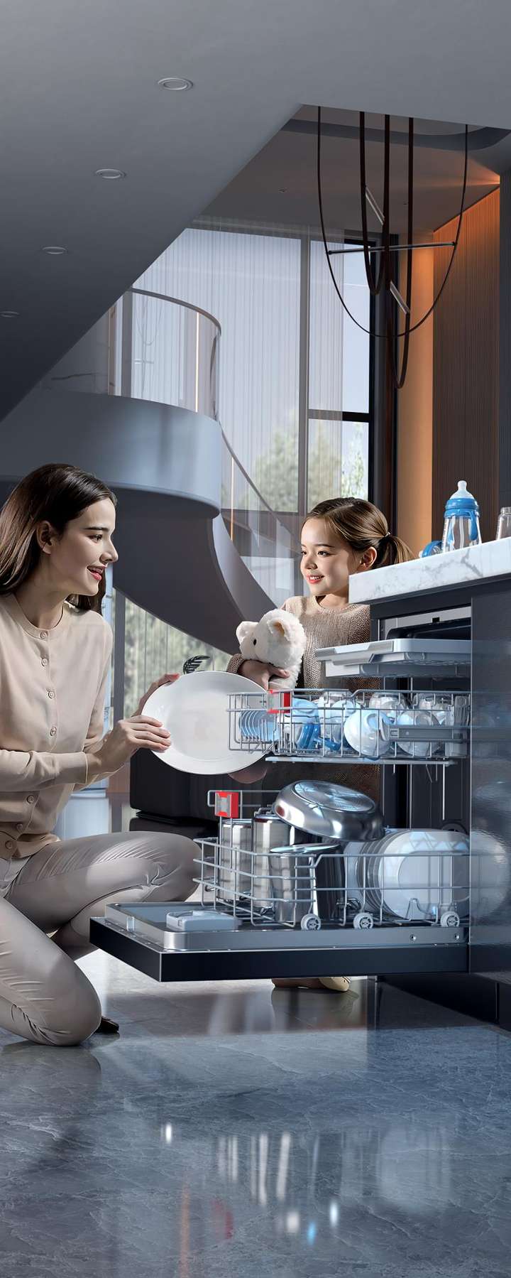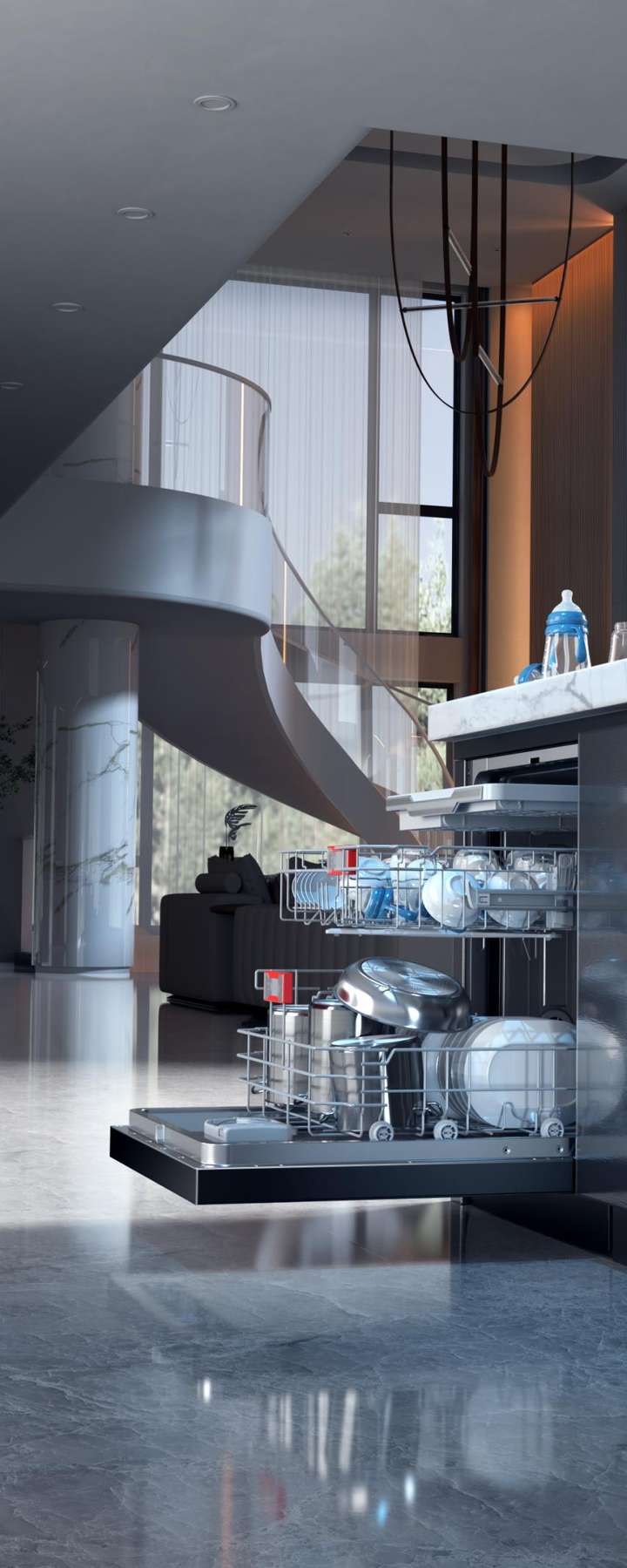 这就好比在洗碗机内部部署了一套精密的雷达阵列,五组喷淋臂协同运作,实现360度万向旋转冲刷。无论是深口汤碗底部的干结污渍,还是异形餐盘的隐蔽角落,亦或是大面积锅具的油腻表面,强劲的水流都能精准抵达,彻底扫除清洁死角。这种近乎偏执的覆盖能力,确保了每一次洗涤都能达到极致洁净的效果,让餐具焕然如新。